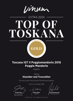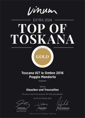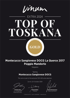 Poggiomandorlo 2016 Toscana IGT, Le Ombre 2016 Toscana IGT e La Querce 2017 Montecucco Sangiovese DOCG hanno ricevuto il premio TOP OF TOSKANA EXTRA 2024